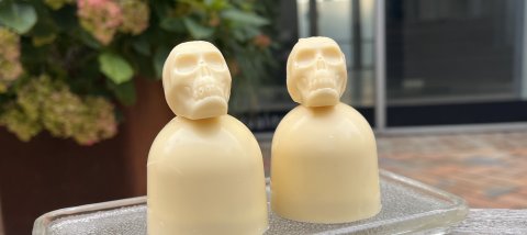 Nogen af skeletterne er også hoppet op på vores flødeboller. Det er vores populære spøgelses-flødeboller. De er med hvide chokolade og hindbærskum. Hvis du bider hovedet af flødebollen, så er den blod-rød inden i. Halloween-flødebollerne sælges til 50 kr. pr. pakke med 2 stk. De sælges fra tirsdag i uge 42 og resten af oktober.