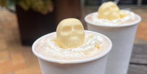 Til Magiske Dage har vi lavet en børnevenlig udgave vores varme chokolade. Den er lavet på en blanding af lys og mørk chokolade – og vi serverer den med flødeskum og et chokolade-kranium på toppen. Kom og mærk magien! Vi sælger denne special-edition af vores varme chokolade fredag og lørdag i uge 42.