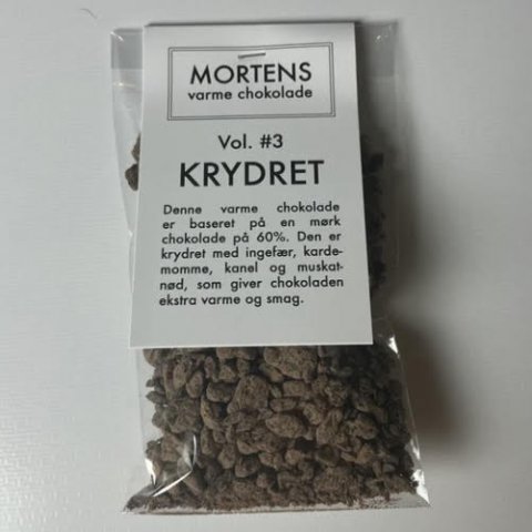 Baseret på en mørk chokolade på 60%. Den er krydret med ingefær, kardemomme, kanel og muskatnød, som giver chokoladen ekstra varme og smag.